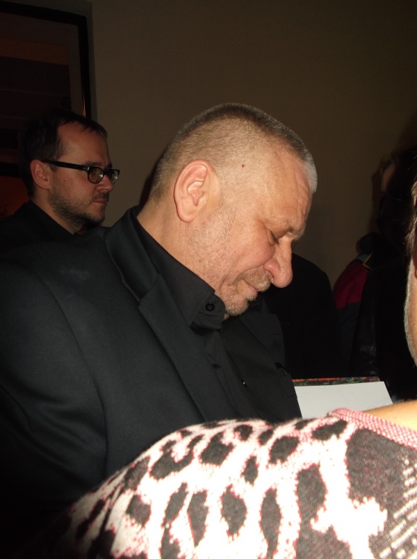 Artysta składa autograf na pamiątkowym albumie zawierającym zdjęcia jego prac.