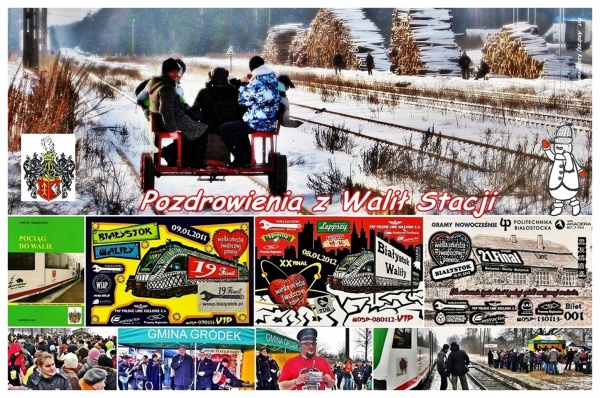 Pocztówka okolicznościowa "Pozdrowienia z Walił Stacji" (wydrukowano 600 sztuk) wydana przez Sztab Białostocki WOŚP 22. Finału, z okazji wyjazdu po raz czwarty pociągu do Walił Stacja. Każdy uczestnik pocztówkę otrzymał za darmo
