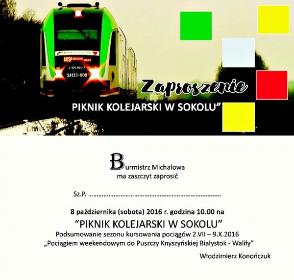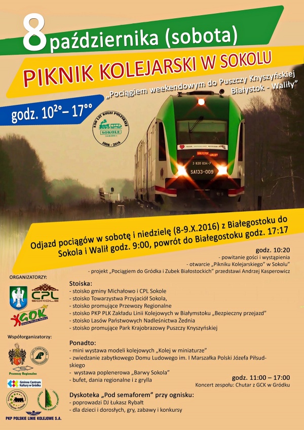 8 października (sobota) 2016 r. godz. 10:20 – 17:00 Podsumowanie sezonu kursowania pociągów 2.VII – 9.X.2016 r. „Pociągiem weekendowym do Puszczy Knyszyńskiej Białystok - Waliły” Odjazd pociągów w sobotę i niedzielę (8-9.X.2016) z Białegostoku do Sokola i Walił godz. 9:00, powrót do Białegostoku godz. 17:17