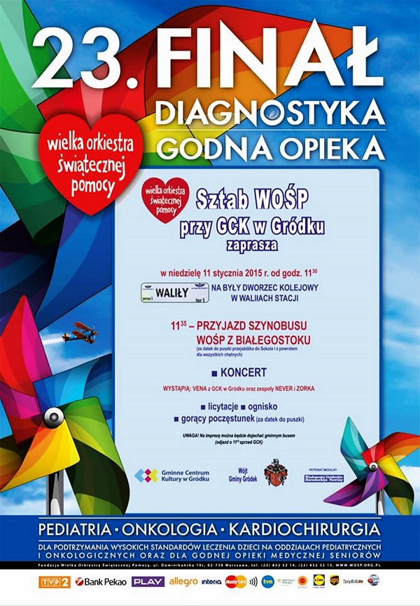 11 stycznia 2015 r. już po raz piąty pojedzie pociąg specjalny WOŚP do Walił Stacji. W programie: występy zespołów, licytacje, ognisko, bigos, kiełbaski i przejażdżka szynobusem na trasie: Waliły – Sokole – Waliły. Do zobaczenia w Waliłach Stacji i Pociągu !! Sie ma !!