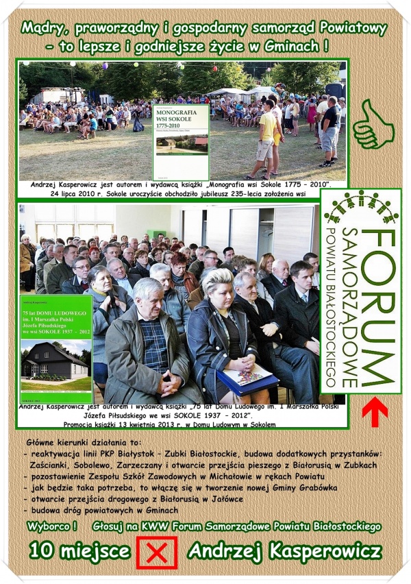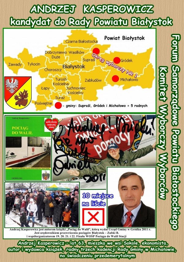 | Treść: | Chciałbym serdecznie podziękować wszystkim, którzy oddali swój głos na moją kandydaturę w wyborach samorządowych do Rady Powiatu Białystok. Dziękuję za słowa wsparcia i za każdy głos oddany na mnie, jak również na moje koleżanki i kolegów z KWW Forum Samorządowe Powiatu Białostockiego w Okręgu Nr 1. Mandatu nie uzyskałam. FSPB niestety w powiecie zdobyło tylko jeden mandat. W Radzie Powiatu z terenu gminy Gródek zasiądzie już po raz czwarty Pani Anna Grycuk z PO i Jan Kaczan z gminy Michałowo z PSL, a także trzech radnych z gminy Supraśl: Wojciech Fiłonowicz z PSL, Marek Szutko z PiS i Michał Kozłowski z PO.
