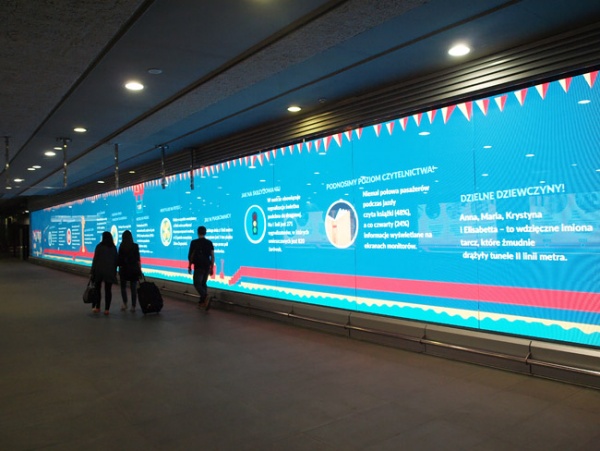 W przejściu podziemnym stacji Świętokrzyska znajdują się multimedialne ściany. | |
