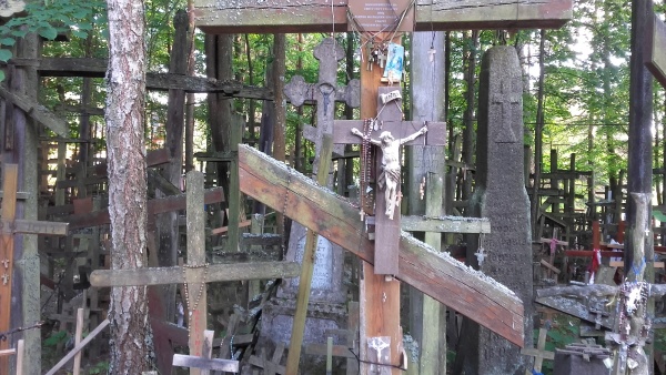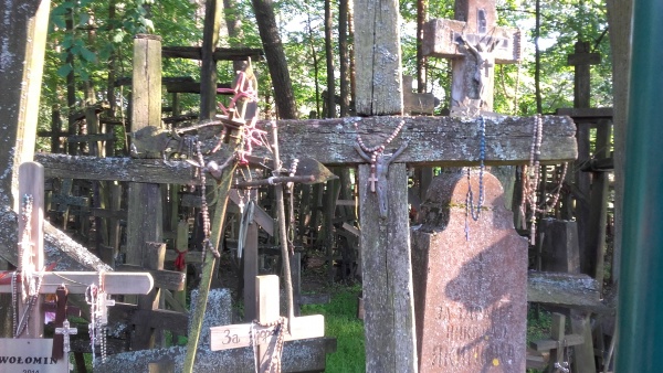 Krzyże obok cerkiewki. Widać akcent katolicki- wiszące różańce.