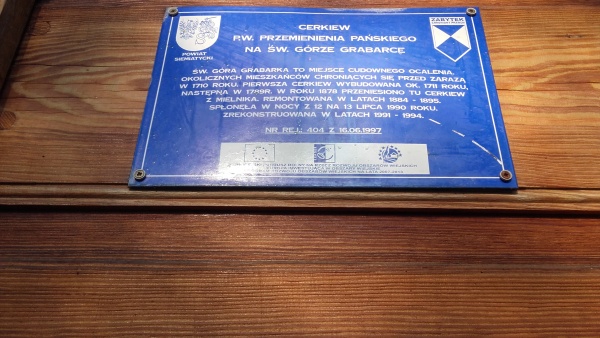 Tablica z informacją o tym miejscu. Wisi na budynku cerkiewki.