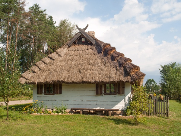 Chałupa ze Starej Grzybowszczyzny (połowa XIX w.). Dach typu dymnikowego, kryty strzechą. | |