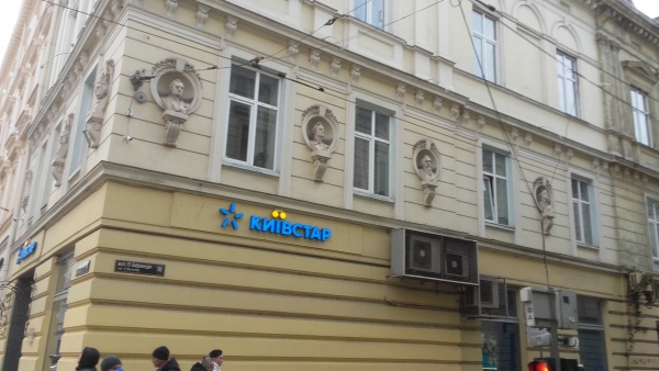 Kamienica, która ozdobiona jest na górze popiersiami znanych Polaków.