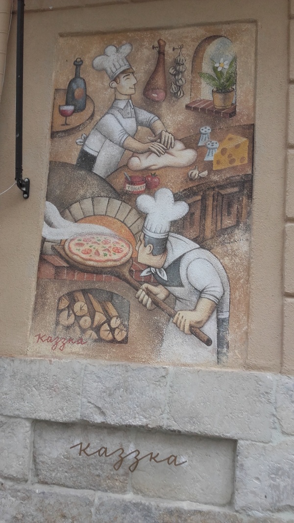 Przy każdej restauracyjce jest ciekawy element zdobniczy. Tu widać zaproszenie do pubu.
