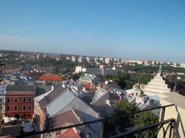 Niebo nade mną, a niżej Stare Miasto. Ten żółty budynek to dawny Trybunał Koronny. To w nim zasłabł przed wielu, wielu laty poeta Jan Kochanowski i niestety zmarł. | |